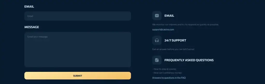 24/7 bereikbaar via livechat en e-mail (Engels). Support helpt met bonuskoppeling (indien toegestaan), documentvereisten, kassiervragen en tools voor verantwoord spelen (limieten, reality checks, tijdelijke sluiting, zelfuitsluiting).