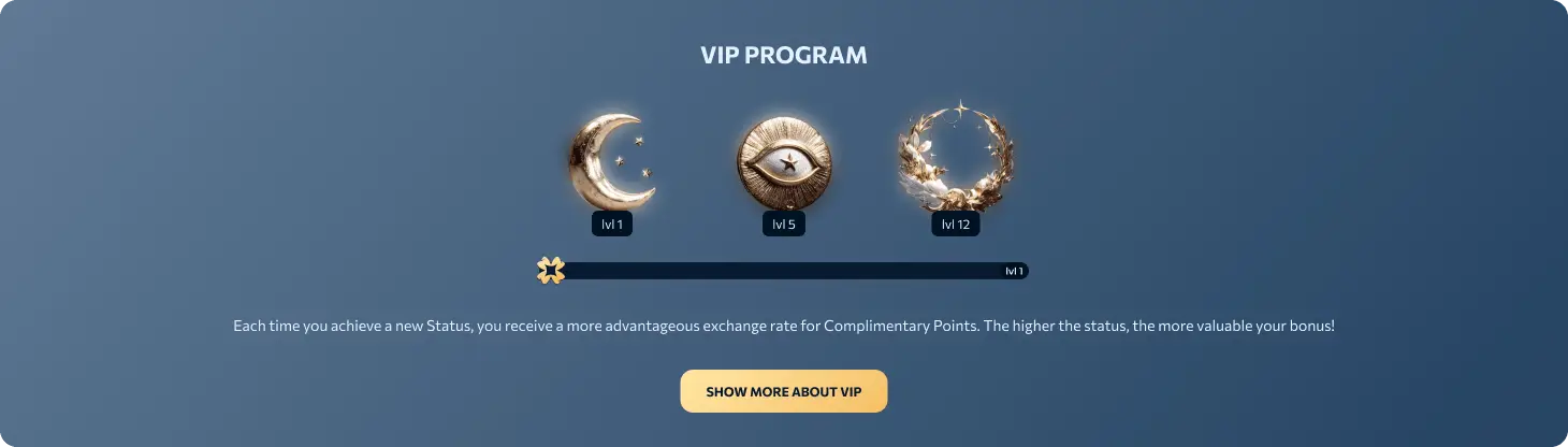 Twaalf niveaus met stijgende perks: hogere reloadpercentages, verbeterde cashback en een eenmalige milestone-beloning op het hoogste level. Vooruitgang is gekoppeld aan echt geldspel; de T&C’s beschrijven puntconversie en spelbijdrage.